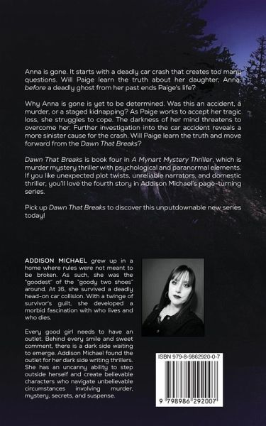 Anna is gone. It starts with a deadly car crash that creates too many questions. Will Paige learn the truth about her daughter, Anna, before a deadly ghost from her past ends Paige's life? Why Anna is gone is yet to be determined. Was this an accident, a murder, or a staged kidnapping? As Paige works to accept her tragic loss, she struggles to cope. The darkness of her mind threatens to overcome her. Further investigation into the car accident reveals a more sinister cause for the crash. Will Paige learn the truth and move forward from the Dawn That Breaks? Dawn That Breaks is book four in A Mynart Mystery Thriller, domestic psychological suspense series with paranormal elements. If you like unexpected plot twists, unreliable narrators, and domestic thriller, you'll love the fourth and final story in Addison Michael's page-turning series. Pick up Dawn That Breaks to discover this unputdownable new series today!
