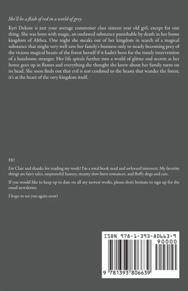 She'll be a flash of red in a world of grey Kyri Dekote is just your average commoner class sixteen year old girl, except for one thing. She was born with magic, an outlawed substance punishable by death in her home kingdom of Althea. One night she sneaks out of her kingdom in search of a magical substance that might very well save her family's business only to nearly becoming prey of the vicious magical beasts of the forest herself if it hadn't been for the timely intervention of a handsome stranger. Her life spirals further into a world of glitter and secrets as her home goes up in flames and everything she thought she knew about her family turns on its head. She soon finds out that evil is not confined to the beasts that wander the forest, it's at the heart of the very kingdom itself.