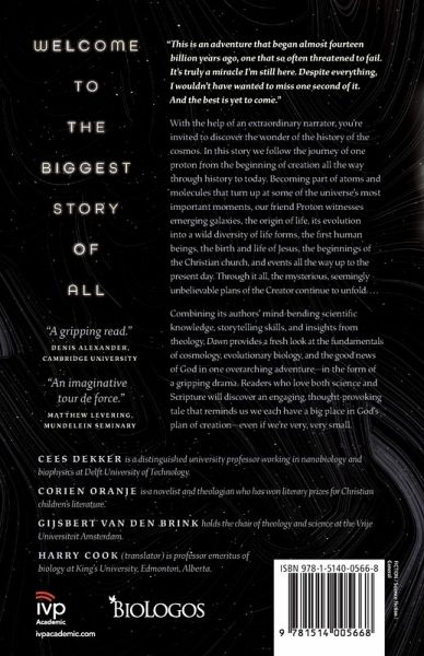This is an adventure that began almost fourteen billion years ago, one that so often threatened to fail. It's truly a miracle I'm still here. Despite everything, I wouldn't have wanted to miss one second of it. And the best is yet to come. With the help of an extraordinary narrator, you're invited to discover the wonder and drama of the history of the cosmos. In this story we follow the journey of one proton who comes into existence at the beginning of creation and makes it all the way through history to today. By becoming a part of atoms and molecules that turn up at some of the universe's most important moments, our friend Proton witnesses emerging galaxies, the origin of life, its evolution into a wild diversity of life forms, the first human beings, the birth and life of Jesus, the beginnings of the Christian church, all the way up to the present day. Through it all, the mysterious, seemingly unbelievable plans of the Creator continue to unfold. . . . Combining its authors' mind-bending scientific knowledge, storytelling skills, and insights from theology, Dawn provides a fresh look at the fundamentals of cosmology, evolutionary biology, and the good news of God in one overarching adventure--in the form of a gripping story. Readers who love both science and Scripture will discover an engaging, thought-provoking tale that reminds us we each have a big place in God's plan of creation--even if we're very, very small. BioLogos Books on Science and Christianity invite us to see the harmony between the sciences and biblical faith on issues including cosmology, biology, paleontology, evolution, human origins, the environment, and more.