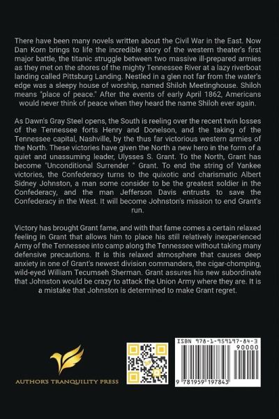 There have been many novels written about the Civil War in the East. Now Dan Korn brings to life the incredible story of the western theater's first major battle, the titanic struggle between two massive ill-prepared armies as they met on the shores of the mighty Tennessee River at a lazy riverboat landing called Pittsburg Landing. Nestled in a glen not far from the water's edge was a sleepy house of worship, named Shiloh Meetinghouse. Shiloh means "place of peace." After the events of early April 1862, Americans would never think of peace when they heard the name Shiloh ever again. As Dawn's Gray Steel opens, the South is reeling over the recent twin losses of the Tennessee forts Henry and Donelson, and the taking of the Tennessee capital, Nashville, by the thus far victorious western armies of the North. These victories have given the North a new hero in the form of a quiet and unassuming leader, Ulysses S. Grant. To the North, Grant has become "Unconditional Surrender " Grant. To end the string of Yankee victories, the Confederacy turns to the quixotic and charismatic Albert Sidney Johnston, a man some consider to be the greatest soldier in the Confederacy, and the man Jefferson Davis entrusts to save the Confederacy in the West. It will become Johnston's mission to end Grant's run. Victory has brought Grant fame, and with that fame comes a certain relaxed feeling in Grant that allows him to place his still relatively inexperienced Army of the Tennessee into camp along the Tennessee without taking many defensive precautions. It is this relaxed atmosphere that causes deep anxiety in one of Grant's newest division commanders, the cigar-chomping, wild-eyed William Tecumseh Sherman. Grant assures his new subordinate that Johnston would be crazy to attack the Union Army where they are. It is a mistake that Johnston is determined to make Grant regret.