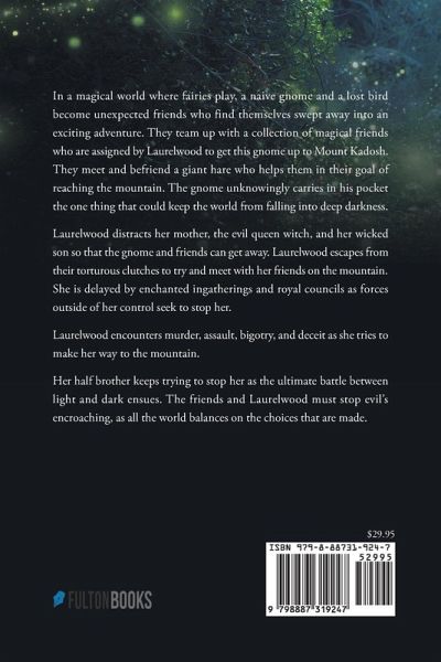 In a magical world where fairies play, a naive gnome and a lost bird become unexpected friends who find themselves swept away into an exciting adventure. They team up with a collection of magical friends who are assigned by Laurelwood to get this gnome up to Mount Kadosh. They meet and befriend a giant hare who helps them in their goal of reaching the mountain. The gnome unknowingly carries in his pocket the one thing that could keep the world from falling into deep darkness. Laurelwood distracts her mother, the evil queen witch, and her wicked son so that the gnome and friends can get away. Laurelwood escapes from their torturous clutches to try and meet with her friends on the mountain. She is delayed by enchanted ingatherings and royal councils as forces outside of her control seek to stop her. Laurelwood encounters murder, assault, bigotry, and deceit as she tries to make her way to the mountain. Her half brother keeps trying to stop her as the ultimate battle between light and dark ensues. The friends and Laurelwood must stop evil's encroaching, as all the world balances on the choices that are made.