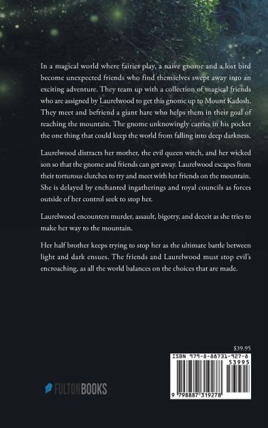 In a magical world where fairies play, a naive gnome and a lost bird become unexpected friends who find themselves swept away into an exciting adventure. They team up with a collection of magical friends who are assigned by Laurelwood to get this gnome up to Mount Kadosh. They meet and befriend a giant hare who helps them in their goal of reaching the mountain. The gnome unknowingly carries in his pocket the one thing that could keep the world from falling into deep darkness. Laurelwood distracts her mother, the evil queen witch, and her wicked son so that the gnome and friends can get away. Laurelwood escapes from their torturous clutches to try and meet with her friends on the mountain. She is delayed by enchanted ingatherings and royal councils as forces outside of her control seek to stop her. Laurelwood encounters murder, assault, bigotry, and deceit as she tries to make her way to the mountain. Her half brother keeps trying to stop her as the ultimate battle between light and dark ensues. The friends and Laurelwood must stop evil's encroaching, as all the world balances on the choices that are made.