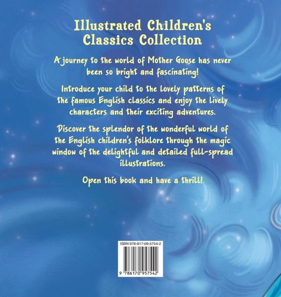 A journey to the world of Mother Goose treasury has never been so bright and fascinating! Introduce your child to lovely patterns of famous English classics and enjoy the lively characters and their exciting adventures of the world renowned nursery rhymes. Discover the splendor of the wonderful world of English children's folklore through the magic window of delightful and detailed full-spread illustrations by a well-known children's book artist. Enter the magnificent realm of Mother Goose rhymes with its exciting characters, places, and lands! Relive your sweet and special childhood moments by reading these nursery rhymes classics to your children. Have fun with such world known nursery classics as One Misty, Moisty Morning; One, Two,Three, Four, Five; Little Jack Horner; Baa, Baa, Black Sheep, and many others. Open this book and have a thrill! Collect other titles from MAGE Illustrated Children's Classics Collection including Rudyard Kipling's stories Make a wonderful gift to a kid's library!