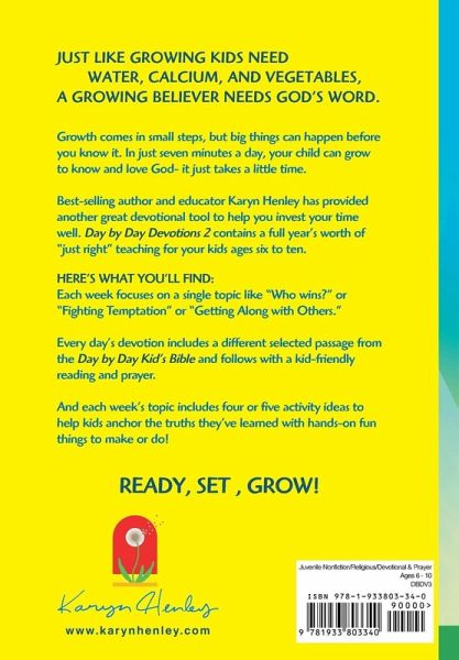 Designed for kids 6-10 who are too old for picture books and too young for grown-up devotionals, this delightful presentation leads kids through a new Bible reading for each day of the year. Each day's devotion includes a Scripture excerpt from the Day by Day Kid's Bible, a kid-friendly devotional thought, and a prayer. Best of all, Day by Day Devotions 2 helps develop a positive impression of the Bible and a spiritual path for children that will last a lifetime.