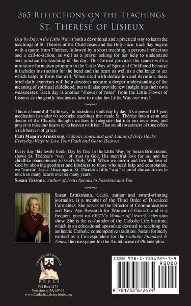 Day by Day in the Little Way is both a devotional and a practical way to learn the teachings of St. Thérèse of the Child Jesus and the Holy Face. Each day begins with a quote from Thérèse, followed by a short teaching, a personal reflection and a call-to-action, as well as a prayer asking for her help to understand and practice the teaching of the day. This format provides the reader with a miniature formation program in the Little Way of Spiritual Childhood because it includes instruction for the head and the heart as well as a challenge to act which helps to form the will. When used with dedication and devotion, these brief daily exercises will help devotees acquire a deeper understanding of the meaning of spiritual childhood, but will also provide new insight into their own weaknesses. Each day is another "shower of roses" from the Little Flower of Lisieux as she gently teaches us how to make her Little Way our way!