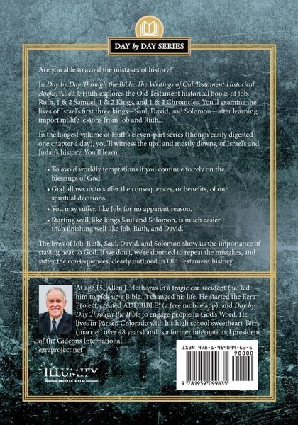 Are you able to avoid the mistakes of history? In Day by Day Through the Bible: The Writings of Old Testament Historical Books, Allen J. Huth explores the Old Testament historical books of Job, Ruth, 1 & 2 Samuel, 1 & 2 Kings, and 1 & 2 Chronicles. You'll examine the lives of Israel's first three kings-Saul, David, and Solomon-after learning important life lessons from Job and Ruth. In the longest volume of Huth's eleven-part series (though easily digested one chapter a day), you'll witness the ups, and mostly downs, of Israel's and Judah's history. You'll learn: ¿ To avoid worldly temptations if you continue to rely on the blessings of God. ¿ God allows us to suffer the consequences, or benefits, of our spiritual decisions. ¿ You may suffer, like Job, for no apparent reason. ¿ Starting well, like kings Saul and Solomon, is much easier than finishing well like Job, Ruth, and David. The lives of Job, Ruth, Saul, David, and Solomon show us the importance of staying near to God. If we don't, we're doomed to repeat the mistakes, and suffer the consequences, clearly outlined in Old Testament history.