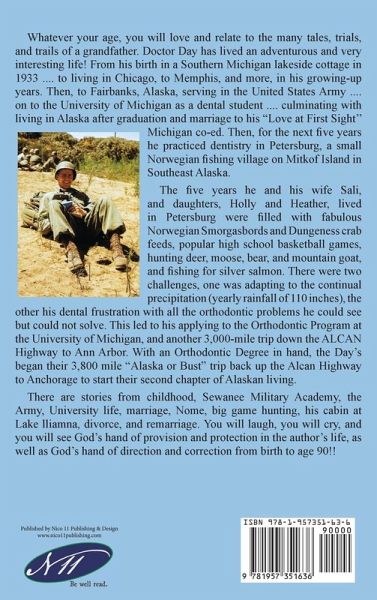 Whatever your age, you will love and relate to the many tales, trials, and trails of a grandfather. Doctor Day has lived an adventurous and very interesting life! From his birth in a Southern Michigan lakeside cottage in 1933 .... to living in Chicago, to Memphis, and more, in his growing-up years. Then, to Fairbanks, Alaska, serving in the United States Army .... on to the University of Michigan as a dental student .... culminating with living in Alaska after graduation and marriage to his "Love at First Sight'' Michigan co-ed. Then, for the next five years he practiced dentistry in Petersburg, a small Norwegian fishing village on Mitkof Island in Southeast Alaska. The five years he and his wife Sali, and daughters, Holly and Heather, lived in Petersburg were filled with fabulous Norwegian Smorgasbords and Dungeness crab feeds, popular high school basketball games, hunting deer, moose, bear, and mountain goat, and fishing for silver salmon. There were two challenges, one was adapting to the continual precipitation (yearly rainfall of 110 inches), the other his dental frustration with all the orthodontic problems he could see but could not solve. This led to his applying to the Orthodontic Program at the University of Michigan, and another 3,000-mile trip down the Alcan Highway to Ann Arbor. With an Orthodontic Degree in hand, the Day's began their 3,800 mile "Alaska or Bust" trip back up the ALCAN Highway to Anchorage to start their second chapter of Alaskan living. There are stories from childhood, Sewanee Military Academy, the Army, University life, marriage, Nome, big game hunting, his cabin at Lake lliamna, divorce, and remarriage. You will laugh, you will cry, and you will see God's hand of provision and protection in the author's life, as well as God's hand of direction and correction from birth to age 90!!