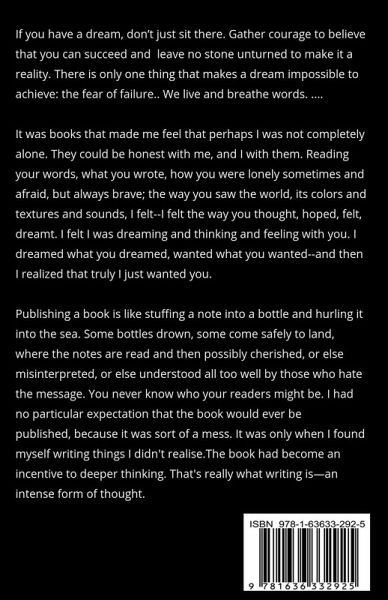 If you have a dream, don’t just sit there. Gather courage to believe that you can succeed and leave no stone unturned to make it a reality. There is only one thing that makes a dream impossible to achieve: the fear of failure. We live and breathe words It was books that made me feel that perhaps I was not completely alone. They could be honest with me, and I with them. Reading your words, what you wrote, how you were lonely sometimes and afraid, but always brave; the way you saw the world, its colors and textures and sounds, I felt--I felt the way you thought, hoped, felt, dreamt. I felt I was dreaming and thinking and feeling with you. I dreamed what you dreamed, wanted what you wanted--and then I realized that truly I just wanted you. Publishing a book is like stuffing a note into a bottle and hurling it into the sea. Some bottles drown, some come safely to land, where the notes are read and then possibly cherished, or else misinterpreted, or else understood all too well by those who hate the message. You never know who your readers might be. I had no particular expectation that the book would ever be published, because it was sort of a mess. It was only when I found myself writing things I didn't realise.The book had become an incentive to deeper thinking. That's really what writing is-an intense form of thought.