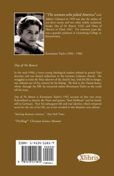 Day of No Return In the mid-1930s, a brave young theological student refused to preach Nazi doctrine and was denied ordination in the German Lutheran church. He struggled to resist the Nazi takeover of the church, but, with his life in danger, was ordered out of the country by his bishop. He fled to the United States, where, through the FBI, he contacted author Kressmann Taylor so she could tell his story. Day of No Return is Kressmann Taylor's 1942 account of that true story, fictionalized to deceive the Nazis and protect "Karl Hoffman" and his family still in Germany. Now his subsequent life and true identity, which remained secret for the rest of her life, are at last revealed in this dramatic new edition. "Stirring dramatic interest." New York Times "Thrilling!" Christian Science Monitor