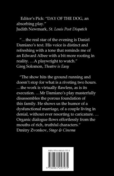 Editor's Pick: "DAY OF THE DOG, an absorbing play." Judith Newmark, Saint Louis Post Dispatch "…the real star of the evening is Daniel Damiano's text. His voice is distinct and refreshing with a tone that reminds me of an Edward Albee with a bit more rooting in reality. …A playwright to watch." Greg Solomon, Theatre is Easy "The show hits the ground running and doesn't stop for what is a riveting two hours. …the work is virtually flawless, as is its execution. …Mr Damiano's play masterfully disassembles the porous foundation of this family. He shows us the humor of a dysfunctional marriage, of a couple living in denial, without ever resorting to caricature. …Organic dialogue flows effortlessly from the mouths of rich, truthful characters." Dmitry Zvonkov, Stage & Cinema