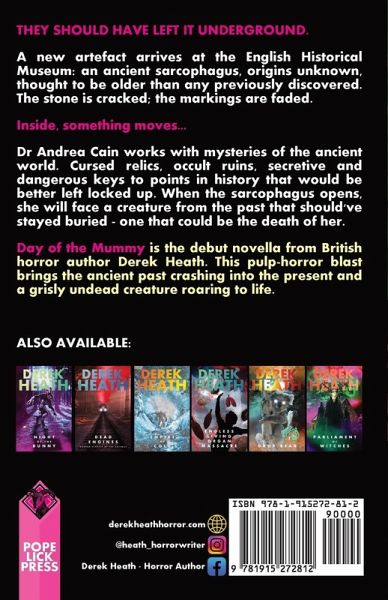 DAY OF THE MUMMY by Derek Heath They should have left it underground. A new artefact arrives at the English Historical Museum: an ancient sarcophagus, origins unknown, thought to be older than any previously discovered. The stone is cracked; the markings are faded. Inside, something moves... Dr Andrea Cain works with mysteries of the ancient world. Cursed relics, occult ruins, secretive and dangerous keys to points in history that would be better left locked up. When the sarcophagus opens, she will face a creature from the past that should've stayed buried - one that could be the death of her. Day of the Mummy is the debut novella from British horror author Derek Heath. This pulp-horror blast brings the ancient past crashing into the present and a grisly undead horror roaring to life. More at derekheathhorror.com.