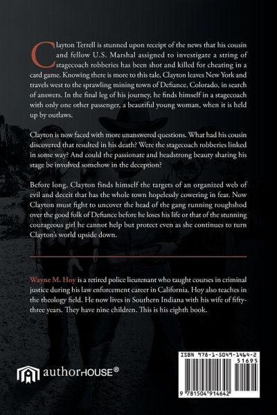 Clayton Terrell is stunned upon receipt of the news that his cousin and fellow U.S. Marshal assigned to investigate a string of stagecoach robberies has been shot and killed for cheating in a card game. Knowing there is more to this tale, Clayton leaves New York and travels west to the sprawling mining town of Defiance, Colorado, in search of answers. In the final leg of his journey, he finds himself in a stagecoach with only one other passenger, a beautiful young woman, when it is held up by outlaws. Clayton is now faced with more unanswered questions. What had his cousin discovered that resulted in his death? Were the stagecoach robberies linked in some way? And could the passionate and headstrong beauty sharing his stage be involved somehow in the deception? Before long, Clayton finds himself the targets of an organized web of evil and deceit that has the whole town hopelessly cowering in fear. Now Clayton must fight to uncover the head of the gang running roughshod over the good folk of Defiance before he loses his life or that of the stunning courageous girl he cannot help but protect even as she continues to turn Clayton's world upside down.