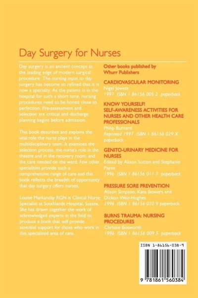 The nursing input to day surgery has become so refined that it is now a distinct speciality. As the patient is in the hospital for such a short time the nursing rituals need to be honed to a fine art. Pre-assessment and selection is critical and discharge planning begins before admission. This book describes and explains the vital role the nurse plays in the multidisciplinary team. It examines the selection process, the nurse's role in the theatre and recovery room, and the care needed on the ward.