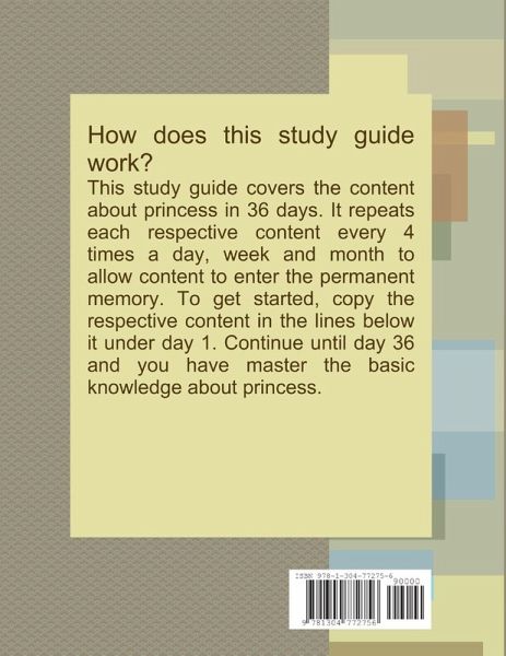 How does this study guide work? This study guide covers the content about princess in 36 days. It repeats each respective content every 4 times a day, week and month to allow content to enter the permanent memory. To get started, copy the respective content in the lines below it under day 1. Continue until day 31 and you have master the basic knowledge about princess.