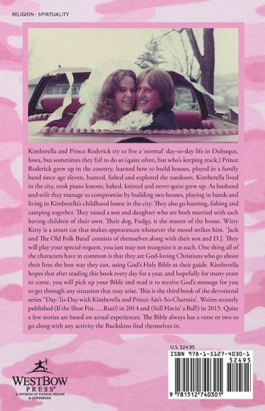 Kimberella and Prince Roderick try to live a 'normal' day-to-day life in Dubuque, Iowa, but sometimes they fail to do so (quite often, but who's keeping track.) Prince Roderick grew up in the country, learned how to build houses, played in a family band since age eleven, hunted, fished and explored the outdoors. Kimberella lived in the city, took piano lessons, baked, knitted and never quite grew up. As husband and wife they manage to compromise by building two houses, playing in bands and living in Kimberella's childhood home in the city. They also go hunting, fishing and camping together. They raised a son and daughter who are both married with each having children of their own. Their dog, Fudgy, is the master of the house. Witty Kitty is a smart cat that makes appearances whenever the mood strikes him. 'Jack and The Old Folk Band' consists of themselves along with their son and D.J. They will play your special request, you just may not recognize it as such. One thing all of the characters have in common is that they are God-loving Christians who go about their lives the best way they can, using God's Holy Bible as their guide. Kimberella hopes that after reading this book every day for a year, and hopefully for many years to come, you will pick up your Bible and read it to receive God's message for you to get through any situation that may arise. This is the third book of the devotional series "Day-To-Day with Kimberella and Prince Ain't-So-Charmin'. Weires recently published (If the Shoe Fits.....Run!) in 2014 and (Still Havin' a Ball!) in 2015. Quite a few stories are based on actual experiences. The Bible always has a verse or two to go along with any activity the Buckskins find themselves in.