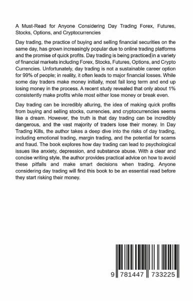 A Must-Read for Anyone Considering Day Trading Forex, Futures, Stocks, Options, and Cryptocurrencies Day trading, the practice of buying and selling financial securities on the same day, has grown increasingly popular due to online trading platforms and the promise of quick profits. Day trading is being practised in a variety of financial markets including Forex, Stocks, Futures, Options, and Crypto Currencies. Unfortunately, day trading is not a sustainable career option for 99% of people; in reality, it often leads to major financial losses. While some day traders make money initially, most fail long term and end up losing money in the process. A recent study revealed that only about 1% consistently make profits while most either lose money or break even. Day trading can be incredibly alluring, the idea of making quick profits from buying and selling stocks, currencies, and cryptocurrencies seems like a dream. However, the truth is that day trading can be incredibly dangerous, and the vast majority of traders lose their money. In Day Trading Kills, the author takes a deep dive into the risks of day trading, including emotional trading, margin trading, and the potential for scams and fraud. The book explores how day trading can lead to psychological issues like anxiety, depression, and substance abuse. With a clear and concise writing style, the author provides practical advice on how to avoid these pitfalls and make smart decisions when trading. Anyone considering day trading will find this book to be an essential read before they start risking their money.