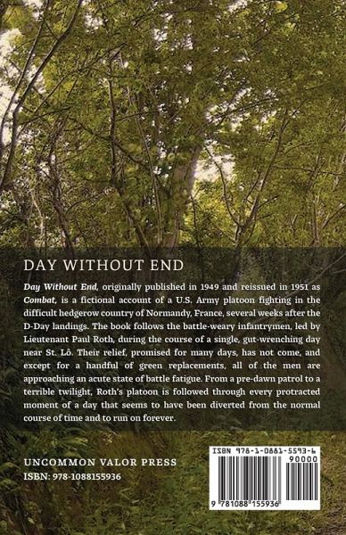 Day Without End, originally published in 1949 and reissued in 1951 as Combat, is a fictional account of a U.S. Army platoon fighting in the difficult hedgerow country of Normandy, France, several weeks after the June 1944 D-Day landings. The book follows the battle-weary infantrymen, led by Lieutenant Paul Roth, during the course of a single, gut-wrenching day near St. Lo. Their relief, promised for many days, has not come, and except for a handful of green replacements, all of the men are approaching an acute state of battle fatigue. From a pre-dawn patrol to a terrible twilight, Roth's platoon is followed through every protracted moment of a day that seems to have been diverted from the normal course of time and to run on forever.