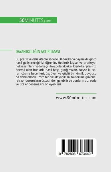 Bu pratik ve özlü kitapla sadece 50 dakikada dayan¿kl¿l¿¿¿n¿z¿ nas¿l geli¿tirece¿inizi ö¿renin. Hepimiz ki¿isel ve profesyonel yäamlar¿m¿zda kaç¿n¿lmaz olarak aksiliklerle kar¿¿lä¿r¿z: önemli olan bunlarla nas¿l bäa ç¿kt¿¿¿m¿zd¿r. Neyse ki, sorun çözme becerileri, özgüven ve güçlü bir kimlik duygusu da dahil olmak üzere bir dizi dayan¿kl¿l¿k faktörüne güvenerek zor durumlar¿n üstesinden gelebilir ve bunlar¿n bizi evde ve i¿te engellemesini önleyebiliriz. Bu kitapta, esnekli¿in size ekip çal¿¿mas¿, ki¿isel yönetim ve stres yönetimi konular¿nda nas¿l yard¿mc¿ olabilece¿ini ö¿reneceksiniz. Ayr¿ca i¿ yerinde dayan¿kl¿l¿¿¿n¿z¿ geli¿tirmeye yönelik faydal¿ ipuçlar¿ ve yäam tarz¿n¿z¿ daha iyimser olacak ¿ekilde uyarlaman¿za yönelik tavsiyeler de içeriyor ve size her türlü aksili¿in üstesinden gelmenizi sälayacak araçlar sunuyor!