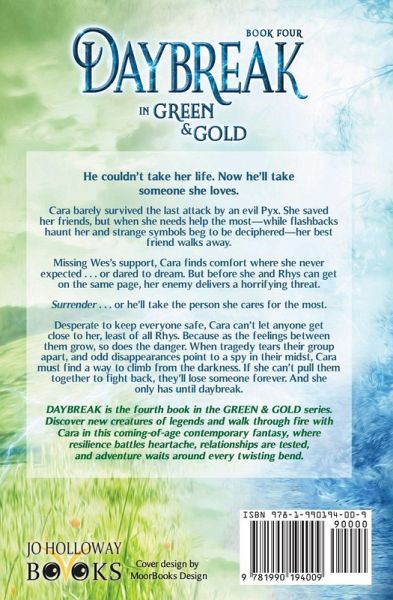 He tried to take her life. Now he'll take someone she loves. Cara barely survived the last attack by an evil Pyx. You'd think almost dying to save her friends would earn her some goodwill. Instead, when she needs help the most-while flashbacks and rogue emotions haunt her, and strange symbols beg to be deciphered-her best friend walks away. Missing Wes's support, Cara turns to the guy she never dreamed might feel the same way she does. But before she and Rhys can get on the same page, her enemy delivers a horrifying threat. Surrender ... or he'll take the person she cares for the most. Desperate to keep everyone safe, Cara can't let anyone get close to her, least of all Rhys. But as the feelings between them grow, so does the danger of their secret. When tragedy tears the group apart, and odd disappearances point to a spy in their midst, Cara will have to pull the shattered pieces of her life back together to fight again before they lose someone forever. And she only has until daybreak. DAYBREAK is the fourth book in the GREEN & GOLD series (and should be read following DARKNESS). Meet creatures of legends and walk through fire with Cara in this coming-of-age contemporary fantasy, where resilience battles heartache, relationships are tested, and adventure waits around every twisting bend.