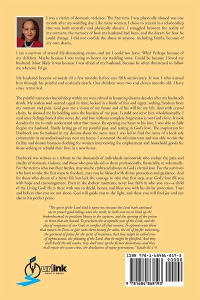 I was a victim of domestic violence. The first time I was physically abused was one month after my wedding day. Like many women, I chose to remain in a relationship that was both mentally and physically abusive. I struggled between the reality of my torment, the memory of how my husband had been, and the dream for how he could change. I did not confide the abuse to anyone, including family, because of my own shame. I am a survivor of several life-threatening events, and yet I could not leave. Why? Perhaps because of my children. Maybe because I was trying to honor my wedding vows. Could be because I loved my husband. Most likely it was because I was afraid of my husband, because he often threatened to follow me wherever I'd go. My husband became seriously ill a few months before our fifth anniversary. It was I who nursed him through his painful and untimely death. Our children were two and eleven months old. I have since remarried. The painful memories buried deep within me were relived in haunting dreams decades after my husband's death. My restless soul seemed caged in time, locked in a battle of fear and regret, seeking freedom from my torment and pain. God gave me a vision of my future and of his will for my life. And with crystal clarity, he showed me by holding onto the burdens of my past, I could not serve him wholeheartedly. I read once feelings buried alive never die, and love without complete forgiveness is not God's love. It took decades for me to truly understand what that meant. By opening my heart to his love, I was able to fully forgive my husband, finally letting go of my painful past, and resting in God's love. The inspiration for Daybreak was formulated in my dreams about the same time I was led to find the name of a local safe community in an undisclosed area near my home. I contacted the administrator and was able to visit the facility and donate business clothing for women interviewing for employment and household goods for those seeking to rebuild their lives in a new home. Daybreak was written as a tribute to the thousands of individuals nationwide who endure the pain and cruelty of domestic violence and those who provide aid to them professionally, financially, or voluntarily. For the victims who lost their battles, may you be embraced always in God's eternal love. For the survivors who have to take the first steps to freedom, may you be blessed with divine protection and guidance. And for those who dream of a better life but lack the courage to take that first step, may God's love fill you with hope and encouragement. Even in the darkest moments, never lose faith in who you are-a child of the Living God! He is there with you to sheld, honor, and bless you with his divine protection. Trust and believe that you are not alone. God will guide you to the light, and there you will find joy and rest also in his perfect peace.