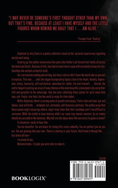 "I may never be someone's First thought Other than my own, But that's fine. Because At least I have myself And the little figures whom remind me Daily That I . . . Am alive." *Excerpt from "Scaling" Daybreak by Amy Davis is a poetry collection based on her personal experiences regarding mental well-being. Growing up, the author moved every few years (her father's job forced their family all across the American South). Because of this, Amy had to learn how to cope with constantly losing the relationships she worked so hard to build. Her vise became reading and writing, but Amy's stories didn't have the depth she so yearned to express. That was . . . until she began incorporating topics close to her heart. Anxiety, depression, stress, insecurity, self-satisfaction, adoration (or, rather, the lack thereof) . . . Overall, the author began to portray an array of many themes in the most beautiful prose/poetry by using their heft and gumption to her advantage. Amy has been collecting these poems for quite some time now, and-finally-she feels like the world is ready for their debut. Within Daybreak, there's a strong sense of growth and beauty. There's also contrast, ups and downs, back and forth . . . whiplash; but, ultimately, self-discovery and hope. The author prays that these poems might encourage others, might show them that their hardships aren't too difficult to overcome. While the battle to keep balance within our souls may remain constant, by no means should we succumb to the darkness. Why fall into the abyss when the sun exists to guide us home? To whomever needs to hear this: You are beautiful. You are brave for facing life's every calamity. You are perfect just as you are. You are growing into your own. There's a destiny in your future. You'll make it through this . . . but above all else- I'm proud of you. Welcome home. I'm glad you were able to make it.