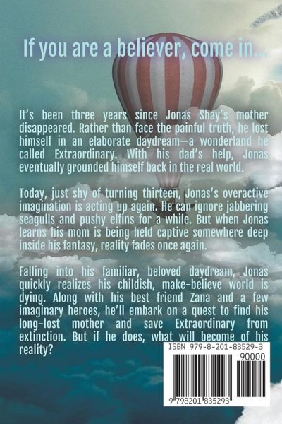 If you are a believer, come in... It's been three years since Jonas Shay's mother disappeared. Rather than face the painful truth, he lost himself in an elaborate daydream-a wonderland he called Extraordinary. With his dad's help, Jonas eventually grounded himself back in the real world. Today, just shy of turning thirteen, Jonas's overactive imagination is acting up again. He can ignore jabbering seagulls and pushy elfins for a while. But when Jonas learns his mom is being held captive somewhere deep inside his fantasy, reality fades once again. Falling into his familiar, beloved daydream, Jonas quickly realizes his childish, make-believe world is dying. Along with his best friend Zana and a few imaginary heroes, he'll embark on a quest to find his long-lost mother and save Extraordinary from extinction. But if he does, what will become of his reality?