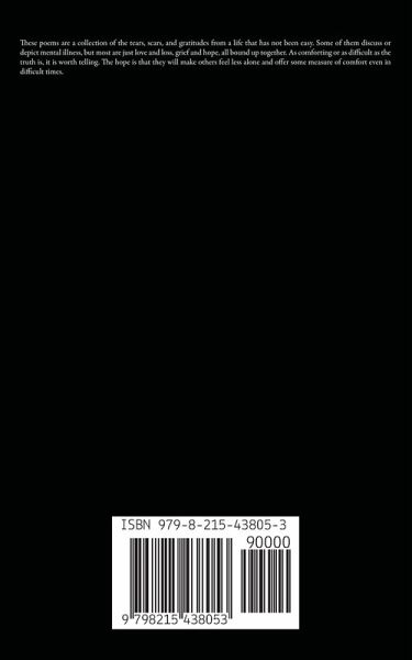 These poems are a collection of the tears, scars, and gratitudes from a life that has not been easy. Some of them discuss or depict mental illness, but most are just love and loss, grief and hope, all bound up together. As comforting or as difficult as the truth is, it is worth telling. The hope is that they will make others feel less alone and offer some measure of comfort even in difficult times.