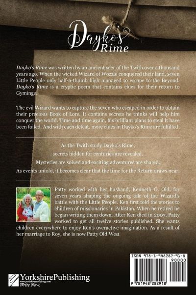 Dayko’s Rime was written by an ancient seer of the Twith over a thousand years ago. When the wicked Wizard of Wozzle conquered their land, seven Little People only half-a-thumb high managed to escape to the Beyond. Dayko’s Rime is a cryptic poem that contains clues for their return to Gyminge. The evil Wizard wants to capture the seven who escaped in order to obtain their precious Book of Lore. It contains secrets he thinks will help him conquer the world. Time and time again, his brilliant plans to steal it have been foiled. And with each defeat, more clues in Dayko’s Rime are fulfilled.