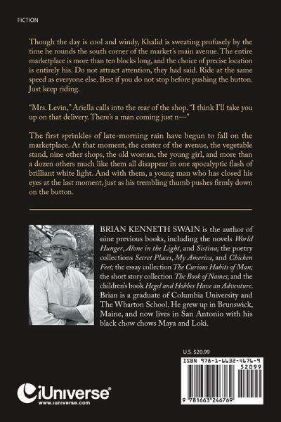 Though the day is cool and windy, Khalid is sweating profusely by the time he rounds the south corner of the market's main avenue. The entire marketplace is more than ten blocks long, and the choice of precise location is entirely his. Do not attract attention, they had said. Ride at the same speed as everyone else. Best if you do not stop before pushing the button. Just keep riding. "Mrs. Levin," Ariella calls into the rear of the shop. "I think I'll take you up on that delivery. There's a man coming just n-" The first sprinkles of late morning rain have begun to fall on the marketplace. At that moment, the center of the avenue, the vegetable stand, nine other shops, the old woman, the young girl, and more than a dozen others much like them all disappear in one apocalyptic flash of brilliant white light. And with them, a young man who has closed his eyes at the last moment, just as his trembling thumb pushes firmly down on the button.