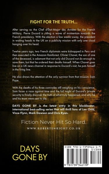 FIGHT FOR THE TRUTH... After serving as the Chef d'État-Major des Armées for the French Military, Pierre Ducard is riding a wave of momentum towards the French presidency. With the election a few weeks away, the president in waiting heads to the UK on a publicity mission with only one cloud hanging over his head. Twelve years ago, two French diplomats were kidnapped in Peru and then executed in the Amazon Rainforest. Olivier Chavet, the son of one of the deceased, is adamant that not only did Ducard not do enough to save them, but that he ordered their deaths himself. When Chavet goes live on a UK news channel in response to Ducard's visit, he puts himself in the firing line. He also draws the attention of the only survivor from that mission: Sam Pope. With the deaths of his three comrades still weighing on his conscience, Sam faces a race against time and the full might of Ducard's private security to finally discover the truth of what truly happened, and why he and his team were sent to die. DAYS GONE BY is the latest entry in this blockbuster, international best-selling series that will thrill fans of Lee Child, Vince Flynn, Mark Dawson and Chris Ryan.