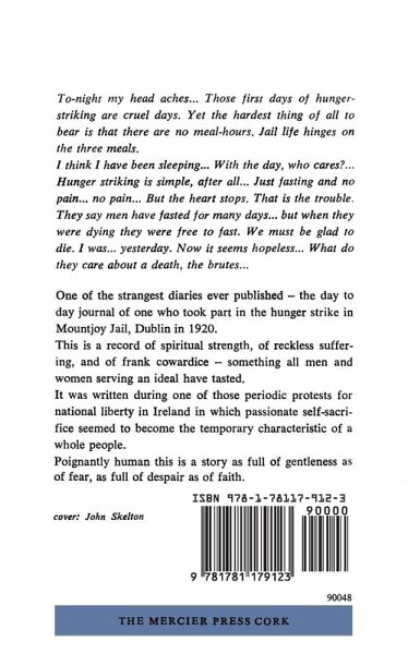 "To-night my head aches ... Those first days of hungerstriking are cruel days. Yet the hardest thing of all to bear is that there are no meal-hours. Jail life hinges on the three meals. I think I have been sleeping ... With the day, who cares? ... Hunger striking is simple, after all ... Just fasting and no pain ... no pain ... But the heart stops. That is the trouble. They say men have fasted for many days ... but when they were dying they were free to fast. We must be glad to die. I was ... yesterday. Now it seems hopeless ... What do they care about a death, the brutes ..." One of the strangest diaries ever published - the day-to-day journal of one who took part in the hunger strike in Mountjoy Jail, Dublin in 1920. This is a record of spiritual strength, of reckless suffering, and of frank cowardice - something all men and women serving an ideal have tasted. It was written during one of those periodic protests for national liberty in Ireland in which passionate self-sacrifice seemed to become the temporary characteristic of a whole people. Poignantly human this is a story as full of gentleness as of fear, as full of despair as of faith.
