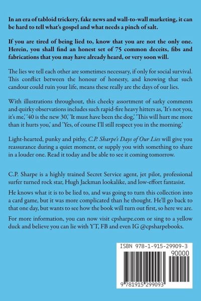 What have you heard? Did it sound real or is someone having you on? In an era of tabloid trickery, fake news, and wall-to-wall marketing, it can be hard to tell what's gospel and what's just yelling with good acoustics. If you are tired of being lied to, know that you are not the only one. Herein you shall find an honest set of 75 common deceits, fibs and fabrications that you may have already been subjected to, or very soon will be. Either way, after reading C.P. Sharpe's Days of Our Lies, you'll be able see through them, and be forewarned. The lies we tell each other often come all too easily, but sometimes they are also necessary, if only for social survival. This conflict between the honour of honesty but knowing that such candour could ruin your life, means these really are the days of our lies. Presented as a rapid-fire collection of sarky comments and quirky observations, each entry is attractively illustrated and accompanied by a carefully appropriated quotation to match the mood. Includes such heavy hitters as:"It's not you, it's me." "I just need some time to myself." "Due to the economic situation we've had to put pay rises on hold." "This will hurt me more than it does you." "The Earth is flat." "Yes, of course I'll still respect you in the morning." Light-hearted, punky and pithy, C.P. Sharpe's Days of Our Lies will give you reassurance during a quiet moment or provide you with something to share in a louder one. Download today and be able to see it coming tomorrow. (Although the content is certainly not explicit, some of the themes explored do address life experience and are somewhat grown-up in nature - e.g. relationships, alcohol, money, technology, the workplace, mild sexual references - so in that sense, this book is not recommended for minors.)