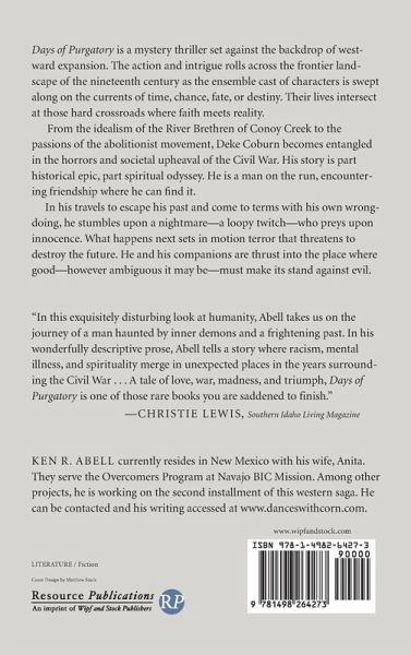 Days of Purgatory is a mystery thriller set against the backdrop of westward expansion. The action and intrigue rolls across the frontier landscape of the nineteenth century as the ensemble cast of characters is swept along on the currents of time, chance, fate, or destiny. Their lives intersect at those hard crossroads where faith meets reality. From the idealism of the River Brethren of Conoy Creek to the passions of the abolitionist movement, Deke Coburn becomes entangled in the horrors and societal upheaval of the Civil War. His story is part historical epic, part spiritual odyssey. He is a man on the run, encountering friendship where he can find it. In his travels to escape his past and come to terms with his own wrongdoing, he stumbles upon a nightmare--a loopy twitch--who preys upon innocence. What happens next sets in motion terror that threatens to destroy the future. He and his companions are thrust into the place where good--however ambiguous it may be--must make its stand against evil.