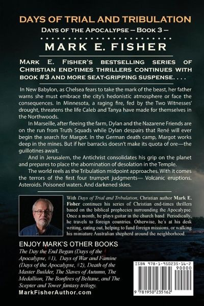 Mark E. Fisher's bestselling series of Christian end-times novels continues with book #3 and more seat-gripping suspense. . . . In New Babylon, as Chelsea fears to take the mark of the beast, her father warns she must embrace the city's hedonistic atmosphere or face the consequences. In Minnesota, a raging fire, fed by the Two Witnesses' drought, threatens the life Caleb and Tanya have made for themselves in the Northwoods. In Marseille, after fleeing the farm, Dylan and the Nazarene Friends are on the run from Truth Squads while Dylan despairs that René will ever begin the search for Margot. In the German death camp, Margot works deep in the mines. But if her barracks doesn't make its quota of ore-the guillotines await. And in Jerusalem, the Antichrist consolidates his grip on the world and prepares to place the abomination of desolation in the Temple. The world reels as the Tribulation midpoint approaches. With it comes the terrors of the first four trumpet judgments-Volcanic eruptions. Asteroids. Poisoned waters. And darkened skies. The biblical signs are being fulfilled daily. Authoritarian governments everywhere are cowing their citizens. Lawlessness and disorder are tearing society apart. The world turns not to God but to immorality. Churches everywhere abandon the Bible and preach apostasy. And to complete the signs-famines and earthquakes in various places. It's all preparing the world for the coming of the Antichrist and the seven years of Tribulation. Heeding the signs of the times, Mark E. Fisher continues Days of the Apocalypse, his bestselling series of Christian end-times thrillers, with book #3, Days of Trial and Tribulation. All books in the series adhere to a Christian worldview and closely follow the biblical end-times events prophesied by God in the books of Revelation, Matthew, Joel, Ezekiel, Daniel, and others.