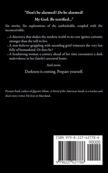 Six stories. Six explorations of the unthinkable coupled with the inconceivable. A discovery that shakes the modern world to its core ignites curiosity stronger than the will to live. A non-believer grappling with unending grief witnesses the very last folly of humankind. A headstrong woman a century ahead of her time encounters a dark malevolence in her family's ancestral home. And more. Darkness is coming. Prepare yourself.