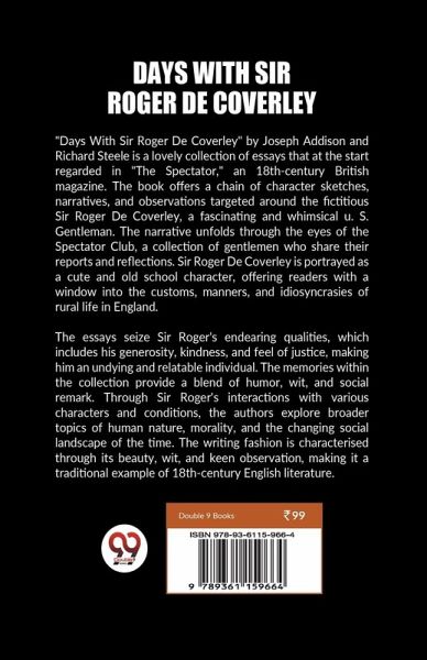 "Days With Sir Roger De Coverley" by Joseph Addison and Richard Steele is a lovely collection of essays that at the start regarded in "The Spectator," an 18th-century British magazine. The book offers a chain of character sketches, narratives, and observations targeted around the fictitious Sir Roger De Coverley, a fascinating and whimsical u. S. Gentleman. The narrative unfolds through the eyes of the Spectator Club, a collection of gentlemen who share their reports and reflections. Sir Roger De Coverley is portrayed as a cute and old school character, offering readers with a window into the customs, manners, and idiosyncrasies of rural life in England. The essays seize Sir Roger's endearing qualities, which includes his generosity, kindness, and feel of justice, making him an undying and relatable individual. The memories within the collection provide a blend of humor, wit, and social remark. Through Sir Roger's interactions with various characters and conditions, the authors explore broader topics of human nature, morality, and the changing social landscape of the time. The writing fashion is characterised through its beauty, wit, and keen observation, making it a traditional example of 18th-century English literature.