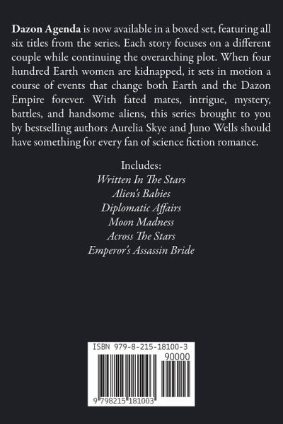 Dazon Agenda is now available in a boxed set, featuring all six titles from the series. Each story focuses on a different couple while continuing the overarching plot. When four hundred Earth women are kidnapped, it sets in motion a course of events that change both Earth and the Dazon Empire forever. With fated mates, intrigue, mystery, battles, and handsome aliens, this series brought to you by bestselling authors Aurelia Skye and Juno Wells should have something for every fan of science fiction romance. Includes: Written In The Stars Alien's Babies Diplomatic Affairs Moon Madness Across The Stars Emperor's Assassin Bride