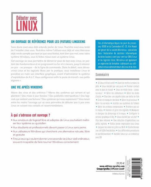 Un ouvrage de référence pour les (futurs) linuxiensSans doute avez-vous déjà entendu parler de Linux. Peut-être avez-vous tenté de l'installer chez vous. Peut-être même l'utilisez-vous déjà et vous êtes-vous déjà rendu compte que tout ce que vous faisiez, tant bien que mal, avec votre système Windows, vous le faites mieux avec un système Linux.Cet ouvrage va vous permettre de démarrer pour de bon avec Linux, en partant des fondamentaux et en progressant au fur et à mesure, jusqu'à devenir un pro - ou presque - de la ligne de commande. Dans le détail, vous découvrirez Linux et les logiciels libres par la pratique, vous installerez Linux et prendrez en main son interface graphique, avant d'administrer le système d'exploitation de A à Z. Vous configurerez enfin le poste de travail "aux petits oignons".Une vie après WindowsMarre des virus et des antivirus ? Marre des systèmes qui rament et qui plantent ? Des mises à jour forcées ? Des publicités intempestives ? Des logiciels qui coûtent une fortune ? Des systèmes qui vous espionnent ? Vous tenez entre les mains l'ouvrage qui va vous permettre de débuter pas à pas avec Linux en suivant nos conseils et recommandations.À qui s'adresse cet ouvrage ?Aux amateurs de logiciel libre et adeptes de Linux souhaitant maîtriser leur système au quotidienAux étudiants et professionnels devant passer à Linux sans peineAux utilisateurs Windows qui cherchent une alternative robuste, libre et gratuiteÀ tous ceux qui veulent donner une seconde vie à leur vieil ordinateur, souvent incapable de faire tourner Windows correctement