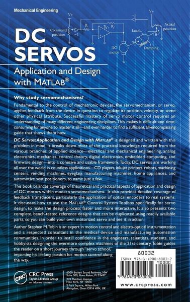 Fundamental to the control of mechatronic devices, the servomechanism applies feedback from the device in question to regulate its position, velocity, or some other physical attribute. Successful mastery of servo control requires an understanding of a wide range of engineering disciplines, making it difficult and time-consuming to master it all-and even harder to find an all-encompassing guide that shows you how. DC Servos: Application and Design with MATLAB® is designed and written with this problem in mind. It breaks down the practical knowledge required from the various branches of applied science-electrical and mechanical engineering, analog electronics, mechanics, control theory, digital electronics, embedded computing, and firmware design-into a cohesive and usable framework. Today, DC servos are working around the world in countless applications-CD players, ink-jet printers, robots, machining centers, vending machines, eyeglass manufacturing machines, home appliances, and automotive seat positioners, just to name a few. This book balances coverage of theoretical and practical aspects of application and design of DC servomechanisms. It also provides detailed coverage of feedback transducers, particularly the application of optical encoders to real systems. It covers how to use the MATLAB® Control System Toolbox specifically for servo design, to make the design process faster and more interactive. It also presents two complete, bench-tested reference designs that can be duplicated using readily available parts, so you can build your own servo and see it in action. Author Stephen M. Tobin is an expert in motion control and electro-optical instrumentation and a respected consultant in the medical device and manufacturing automation communities. In order to instill confidence in the engineers, scientists, students, and hobbyists designing the ever more complex machines of the 21st century, Tobin guides the reader on a short journey through "servo school," imparting his lifelong passion for motion control along the way.