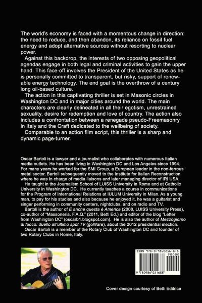 This is a thriller in which every chapter heightens the suspense. The subtext is the energy crisis that affects the global economy; the hero is a Bond-like daredevil. The world's economy is faced with a momentous change in direction: the need to reduce, and then abandon, its reliance on fossil fuel energy and adopt alternative sources without resorting to nuclear power. Against this backdrop, the interests of two opposing geopolitical agendas engage in both legal and criminal activities to gain the upper hand. This face-off involves the President of the United States as he is personally committed to transparent, but risky, support of renewable energy technology. The end goal is the overthrow of a century long oil-based culture. The action in this captivating thriller is set in Masonic circles in Washington DC and in major cities around the world. The main characters are clearly delineated in all their egotism, unrestrained sexuality, desire for redemption and love of country. The battlefield is populated by Arab sheiks, Mexican and Colombian drug cartels, the Russian Mafia with Italian associates, Masonic lodges, Washington lobbies, and the secret services. It is in the secret services that we find the hero, an Italian-American daredevil, who first served in the Navy Seals and then in the CIA. The action also includes the confrontation between a renegade pseudo-Freemasonry in Italy and the Craft dedicated to the wellbeing of society. Comparable to an action film script, this thriller is a sharp and dynamic page-turner.