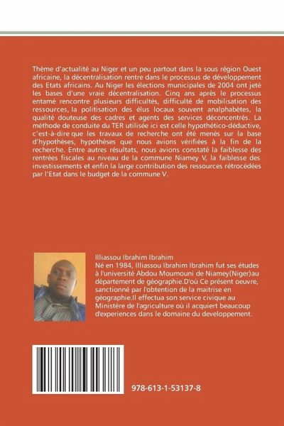 Thème d actualité au Niger et un peu partout dans la sous région Ouest africaine, la décentralisation rentre dans le processus de développement des Etats africains. Au Niger les élections municipales de 2004 ont jeté les bases d une vraie décentralisation. Cinq ans après le processus entamé rencontre plusieurs difficultés, difficulté de mobilisation des ressources, la politisation des élus locaux souvent analphabètes, la qualité douteuse des cadres et agents des services déconcentrés. La méthode de conduite du TER utilisée ici est celle hypothético-déductive, c est-à-dire que les travaux de recherche ont été menés sur la base d hypothèses, hypothèses que nous avions vérifiées à la fin de la recherche. Entre autres résultats, nous avions constaté la faiblesse des rentrées fiscales au niveau de la commune Niamey V, la faiblesse des investissements et enfin la large contribution des ressources rétrocédées par l Etat dans le budget de la commune V.