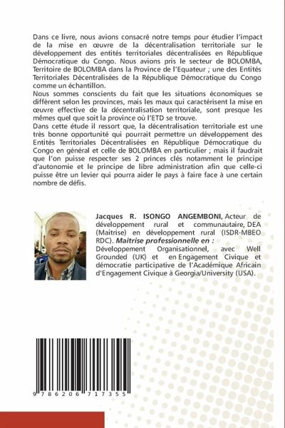 Dans ce livre, nous avions consacré notre temps pour étudier l'impact de la mise en oeuvre de la décentralisation territoriale sur le développement des entités territoriales décentralisées en République Démocratique du Congo. Nous avions pris le secteur de BOLOMBA, Territoire de BOLOMBA dans la Province de l'Equateur ; une des Entités Territoriales Décentralisées de la République Démocratique du Congo comme un échantillon. Nous sommes conscients du fait que les situations économiques se diffèrent selon les provinces, mais les maux qui caractérisent la mise en oeuvre effective de la décentralisation territoriale, sont presque les mêmes quel que soit la province où l'ETD se trouve.Dans cette étude il ressort que, la décentralisation territoriale est une très bonne opportunité qui pourrait permettre un développement des Entités Territoriales Décentralisées en République Démocratique du Congo en général et celle de BOLOMBA en particulier ; mais il faudrait que l'on puisse respecter ses 2 princes clés notamment le principe d'autonomie et le principe de libre administration afin que celle-ci puisse être un levier qui pourra aider le pays à faire face à une certain nombre de défis.