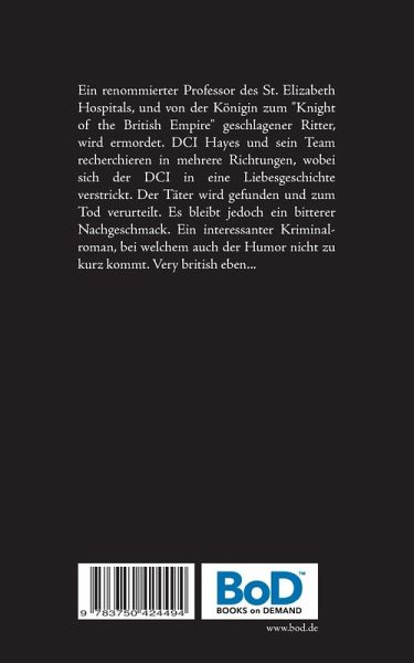 Ein renommierter Professor des St. Elizabeth Hospitals, und von der Königin zum "Knight of the British Empire" geschlagener Ritter, wird ermordet. DCI Hayes und sein Team recherchieren in mehrere Richtungen, wobei sich der DCI in eine Liebesgeschichte verstrickt. Der Täter wird gefunden und zum Tod verurteilt. Es bleibt jedoch ein bitterer Nachgeschmack. Ein interessanter Kriminalroman, bei welchem auch der Humor nicht zu kurz kommt. Very british eben...