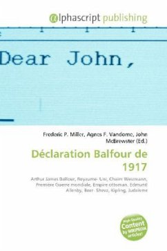 High Quality Content by WIKIPEDIA articles! La Déclaration Balfour de 1917 est une lettre ouverte adressée à Lord Lionel Walter Rothschild (1868-1937), publiée le 2 novembre 1917 par Arthur James Balfour, le ministre britannique des Affaires Étrangères, en accord avec Chaim Weizmann, alors président de la Fédération Sioniste et qui sera élu en 1948 Président de l'Etat d'Israël. À l'aube de la Première Guerre mondiale, la Palestine fait partie de l'empire ottoman. Les troupes britanniques, emmenées par le Général Sir Edmund Allenby, s'engagent dans une campagne contre les Turcs en 1917. Le 31 octobre, les Britanniques remportent une victoire décisive, dans la ville de Beer-Sheva, ce qui conduit à la capitulation de l'empire ottoman. Le 2 novembre 1917, le Royaume-Uni publie cette lettre dans laquelle il se déclare en faveur de l'établissement en Palestine d'un foyer national pour le peuple juif. C'est aussi l'époque du " Grand Jeu " selon Kipling pour maîtriser les zones riches enpétrole et protégeant l'accès aux Indes.
