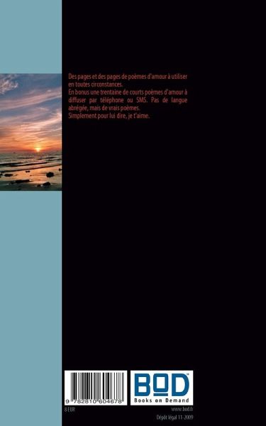 Des pages et des pages de poèmes d'amour à utiliser en toutes circonstances.En bonus une trentaine de courts poèmes d'amour à diffuser par téléphone ou SMS. Pas de langue abrégée, mais de vrais poèmes.Simplement pour lui dire, je t'aime.