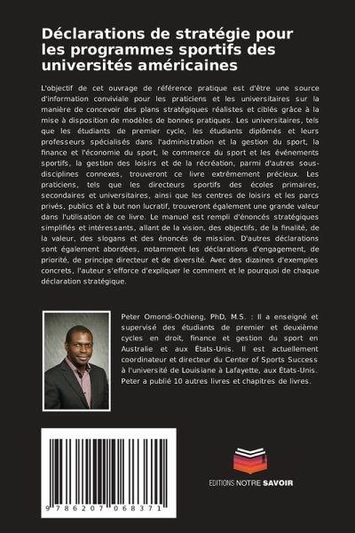 L'objectif de cet ouvrage de référence pratique est d'être une source d'information conviviale pour les praticiens et les universitaires sur la manière de concevoir des plans stratégiques réalistes et ciblés grâce à la mise à disposition de modèles de bonnes pratiques. Les universitaires, tels que les étudiants de premier cycle, les étudiants diplômés et leurs professeurs spécialisés dans l'administration et la gestion du sport, la finance et l'économie du sport, le commerce du sport et les événements sportifs, la gestion des loisirs et de la récréation, parmi d'autres sous-disciplines connexes, trouveront ce livre extrêmement précieux. Les praticiens, tels que les directeurs sportifs des écoles primaires, secondaires et universitaires, ainsi que les centres de loisirs et les parcs privés, publics et à but non lucratif, trouveront également une grande valeur dans l'utilisation de ce livre. Le manuel est rempli d'énoncés stratégiques simplifiés et intéressants, allant de la vision, des objectifs, de la finalité, de la valeur, des slogans et des énoncés de mission. D'autres déclarations sont également abordées, notamment les déclarations d'engagement, de priorité, de principe directeur et de diversité. Avec des dizaines d'exemples concrets, l'auteur s'efforce d'expliquer le comment et le pourquoi de chaque déclaration stratégique.
