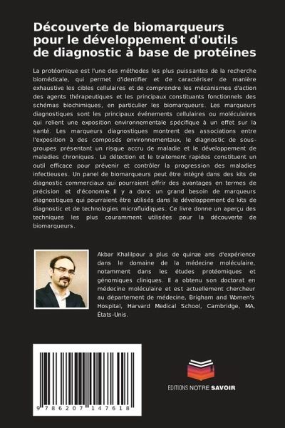 La protéomique est l'une des méthodes les plus puissantes de la recherche biomédicale, qui permet d'identifier et de caractériser de manière exhaustive les cibles cellulaires et de comprendre les mécanismes d'action des agents thérapeutiques et les principaux constituants fonctionnels des schémas biochimiques, en particulier les biomarqueurs. Les marqueurs diagnostiques sont les principaux événements cellulaires ou moléculaires qui relient une exposition environnementale spécifique à un effet sur la santé. Les marqueurs diagnostiques montrent des associations entre l'exposition à des composés environnementaux, le diagnostic de sous-groupes présentant un risque accru de maladie et le développement de maladies chroniques. La détection et le traitement rapides constituent un outil efficace pour prévenir et contrôler la progression des maladies infectieuses. Un panel de biomarqueurs peut être intégré dans des kits de diagnostic commerciaux qui pourraient offrir des avantages en termes de précision et d'économie. Il y a donc un grand besoin de marqueurs diagnostiques qui pourraient être utilisés dans le développement de kits de diagnostic et de technologies microfluidiques. Ce livre donne un aperçu des techniques les plus couramment utilisées pour la découverte de biomarqueurs.