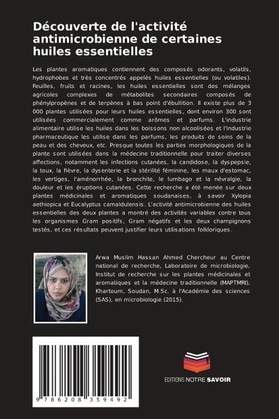Les plantes aromatiques contiennent des composés odorants, volatils, hydrophobes et très concentrés appelés huiles essentielles (ou volatiles). Feuilles, fruits et racines, les huiles essentielles sont des mélanges agricoles complexes de métabolites secondaires composés de phénylpropènes et de terpènes à bas point d'ébullition. Il existe plus de 3 000 plantes utilisées pour leurs huiles essentielles, dont environ 300 sont utilisées commercialement comme arômes et parfums. L'industrie alimentaire utilise les huiles dans les boissons non alcoolisées et l'industrie pharmaceutique les utilise dans les parfums, les produits de soins de la peau et des cheveux, etc. Presque toutes les parties morphologiques de la plante sont utilisées dans la médecine traditionnelle pour traiter diverses affections, notamment les infections cutanées, la candidose, la dyspepsie, la toux, la fièvre, la dysenterie et la stérilité féminine, les maux d'estomac, les vertiges, l'aménorrhée, la bronchite, le lumbago et la névralgie, la douleur et les éruptions cutanées. Cette recherche a été menée sur deux plantes médicinales et aromatiques soudanaises, à savoir Xylopia aethiopica et Eucalyptus camaldulensis. L'activité antimicrobienne des huiles essentielles des deux plantes a montré des activités variables contre tous les organismes Gram positifs, Gram négatifs et les deux champignons testés, et ces résultats peuvent justifier leurs utilisations folkloriques.
