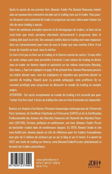 Ce livre n'est pas un livre sur le trading et la Bourse comme les autres ! Il vous offre un accès unique pour vous permettre d'assister à un webinaire en direct avec l'auteur. Tout est expliqué à la page 34 du présent livre. Réputé pour sa grande pédagogie, vous profiterez de ce moment privilégié pour progresser ou découvrir le monde du trading en compte propre. ATTENTION : Cet accès exceptionnel au monde du trading n'est accordé que pour l'achat d'un livre neuf. L'accès au trading live avec un livre d'occasion est impossible. Après le succès de son premier livre Devenez Trader Pro, Benoist Rousseau revient avec un nouveau livre concentré non plus sur le trading mais sur le trader. Vous pourrez découvrir votre potentiel de trader et progresser sur vous-même pour trouver les clés de votre trading à succès. Nourri de nombreux exemples concrets et de témoignages de traders, ce livre est un must-have que toute personne cherchant sérieusement à progresser dans le trading doit avoir lu et relu. Des concepts inédits dans le trading vont vous repousser dans vos retranchements pour faire de vous le trader que vous méritez d'être. Il est temps de franchir un level, vous le méritez. "Devenez trader pro", le précédent livre de Benoist Rousseau, fondateur du site Andlil.com, est un bestseller traduit dans de nombreuses langues.