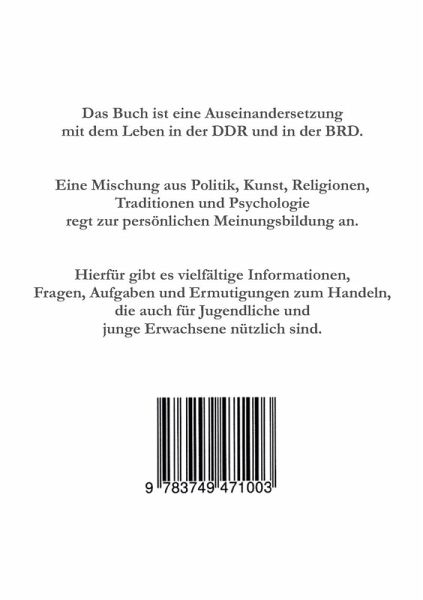 Das Buch ist eine Auseinandersetzung mit dem Leben in der DDR und in der BRD.Eine Mischung aus Politik,Kunst,Religionen, Traditionen und Psychologie regt zur persönlichen Meinungsbildung, zu Selbststärkungen und zum Aufstehen an.Hierfür gibt es vielfältige Informationen, Fragen, Aufgaben und Ermutigungen zum Handeln, die auch für Jugendliche und junge Erwachsene nützlich sind.